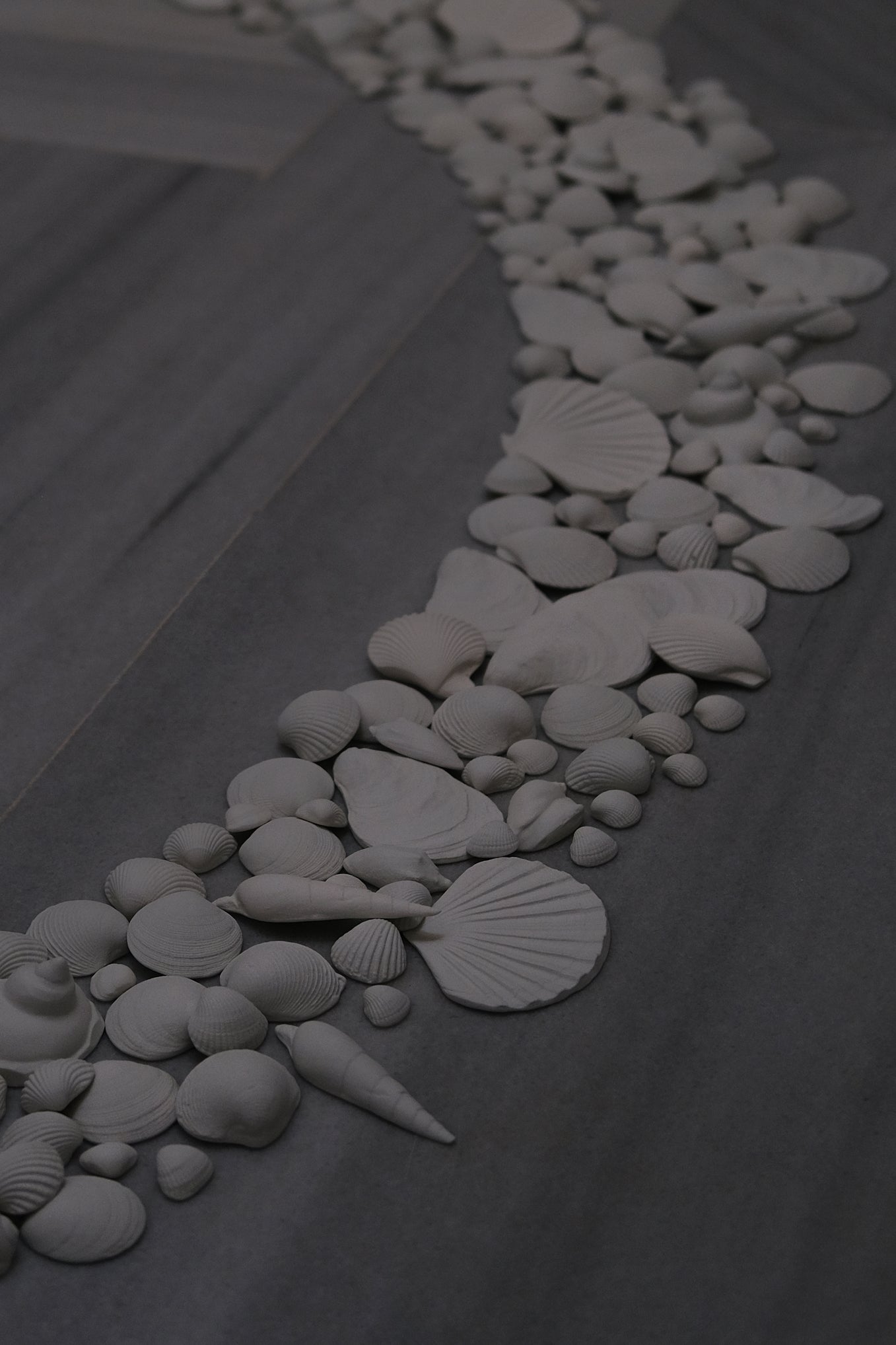 Over a number of years, Ezgi has been collecting shells, a selection of these have been casted by the artist in porcelain as amulets: objects that are expected to radiate protective power. A shell elicits duality; it serves as a shield protecting the vulnerable creature living within, also they are fragile and break easily. The porcelain shells forming the circle are asymmetrical, ridged, and whorled, stressing the stages of growth and change.