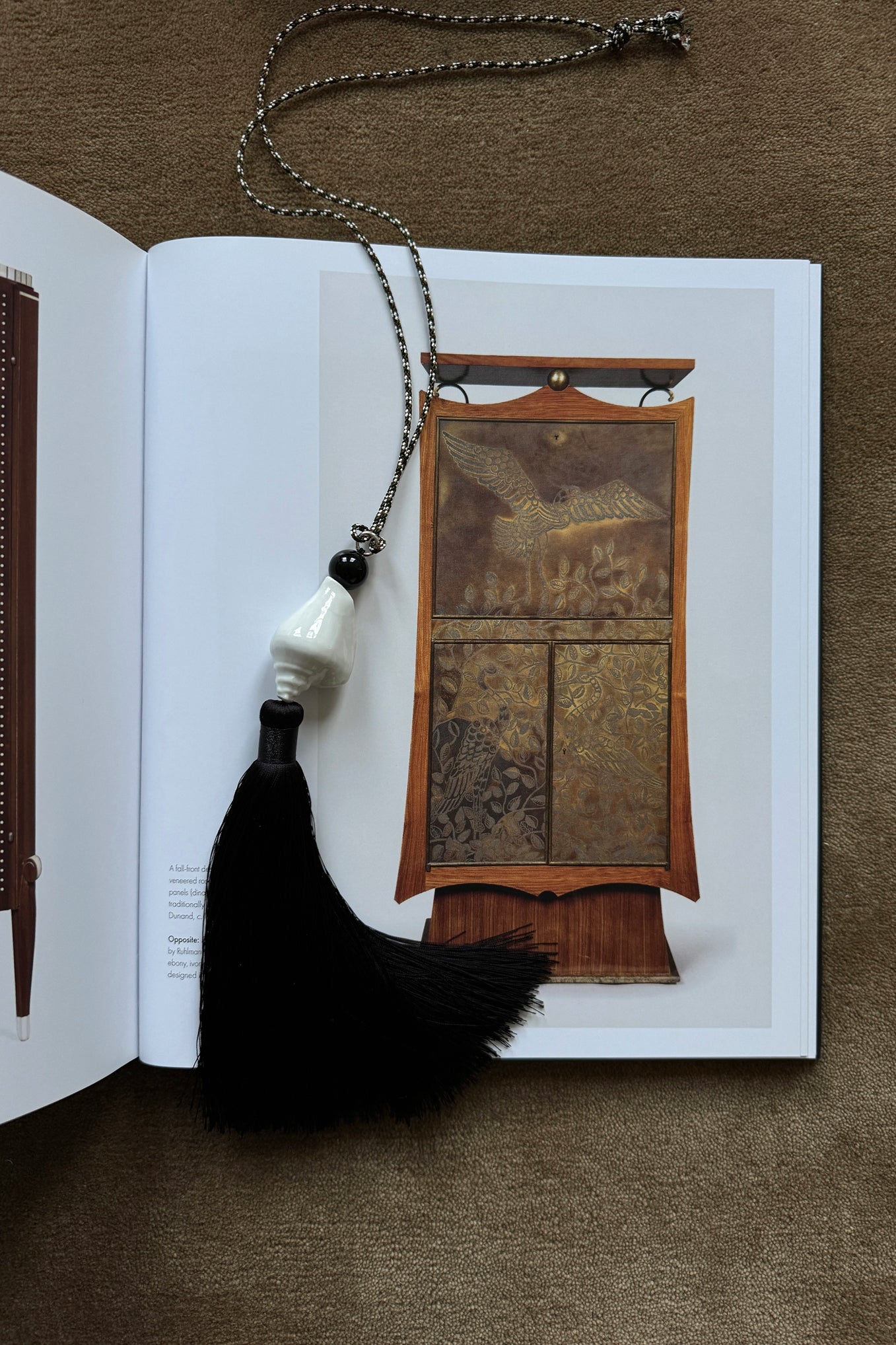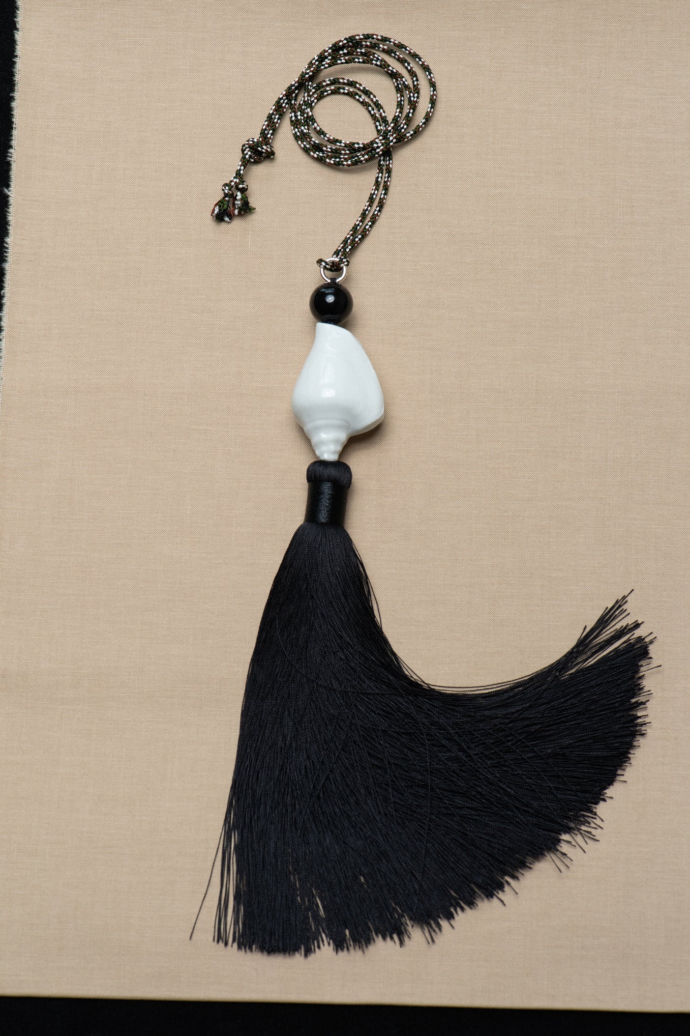 Handmade porcelain shell sculptures are combined with natural gemstones, silver and tassels layering narratives, strung on handwoven Japanese silk; weaving together ancient and contemporary themes.