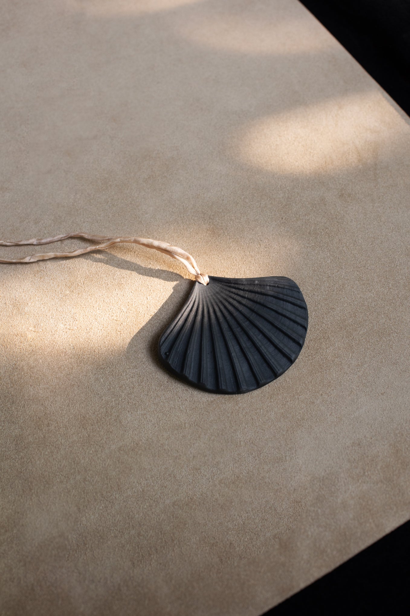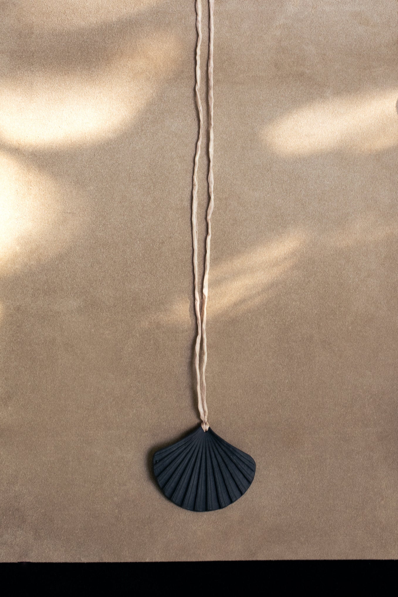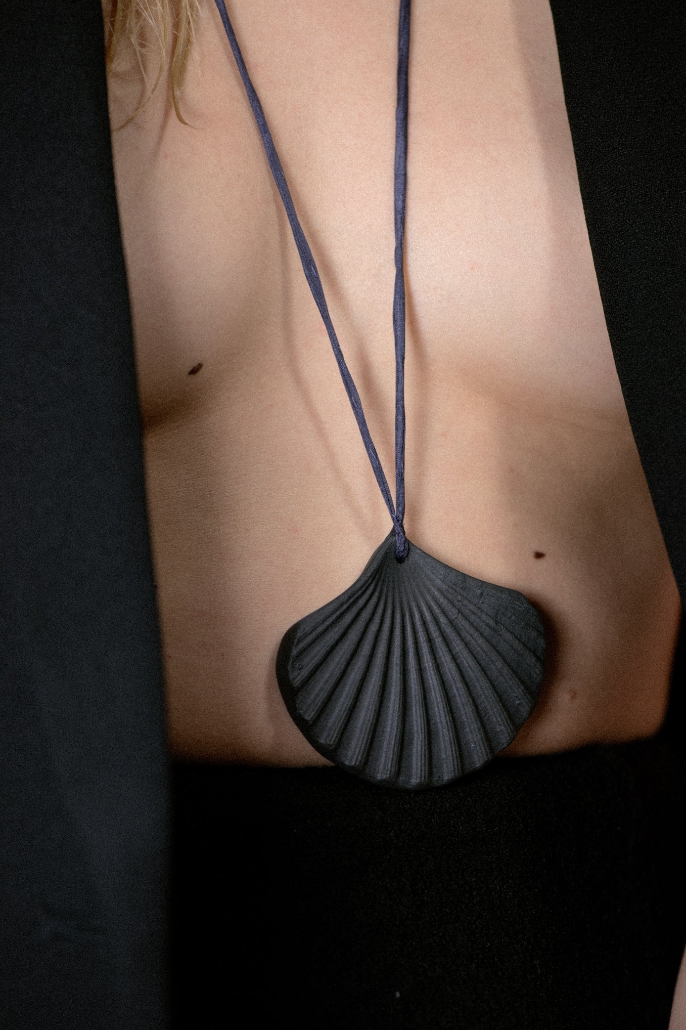 Sculpted from black pigmented porcelain and strung on a silk cord, these Nocturnal Shell Amulets symbolises "night" as opposition to "day" as a way to celebrate the dualistic principle to achieve the perfect harmony.