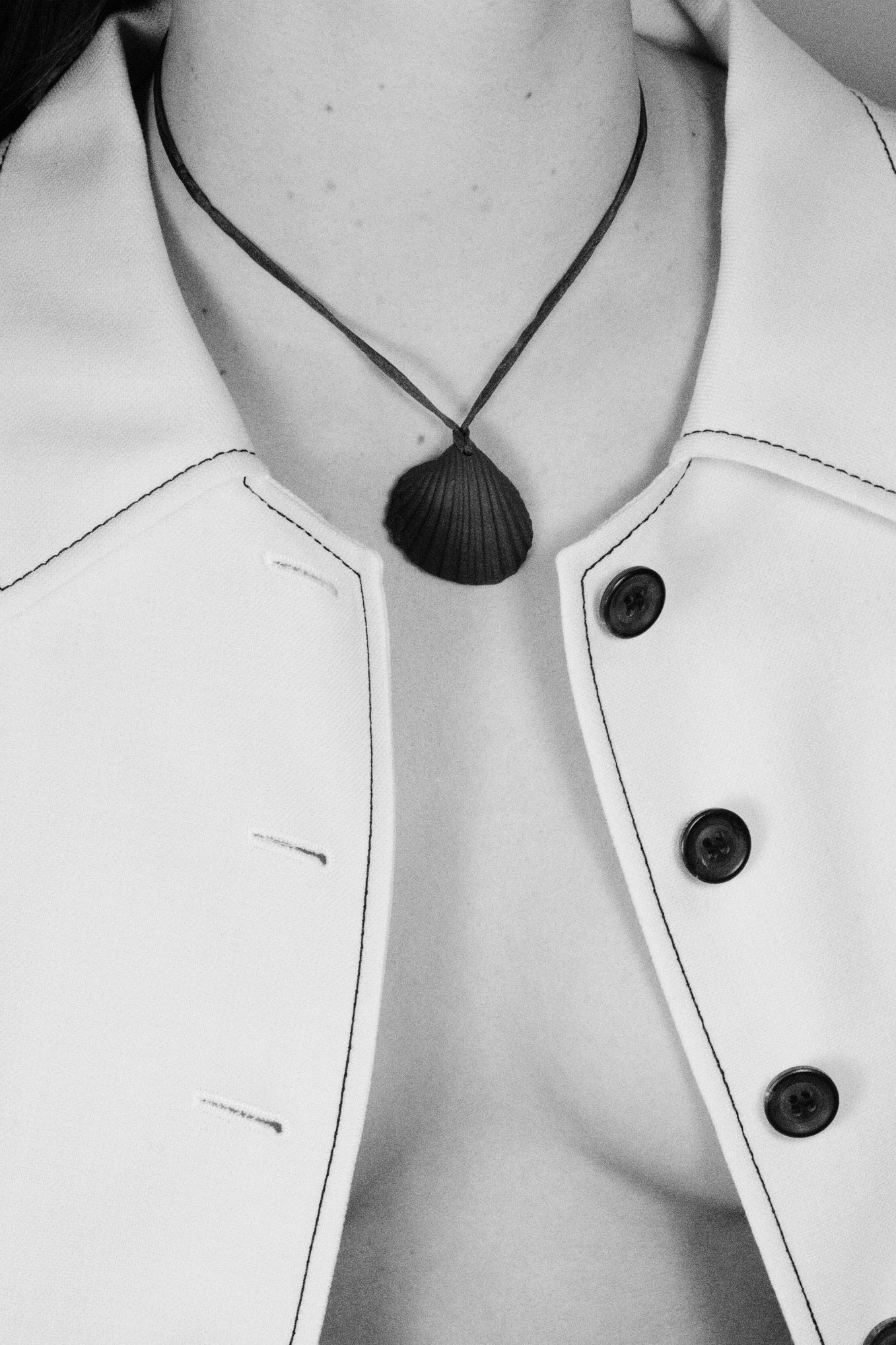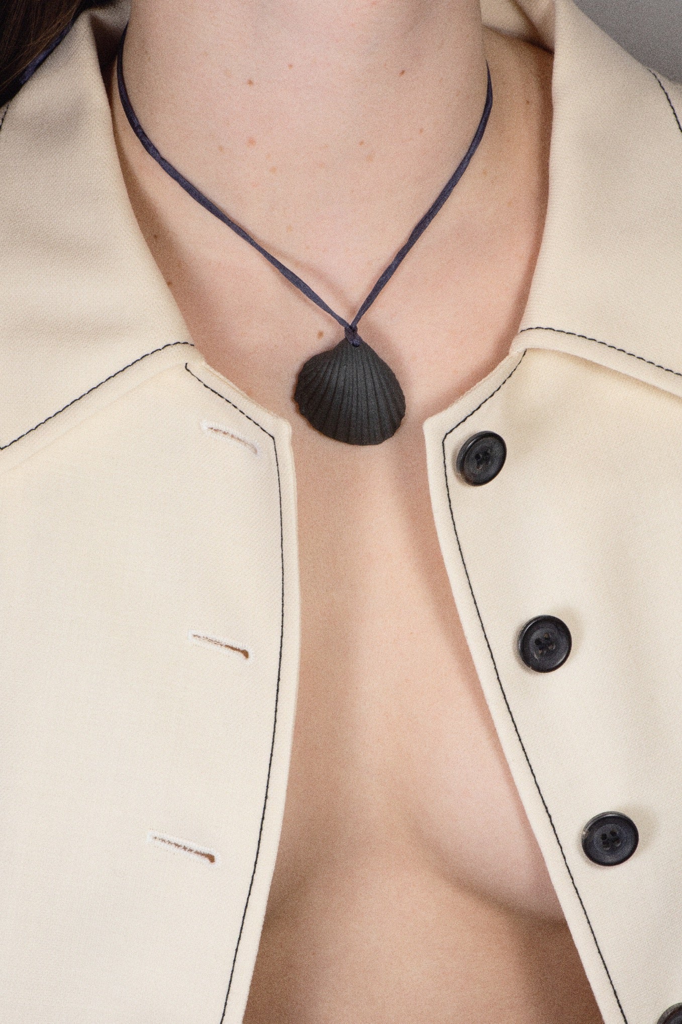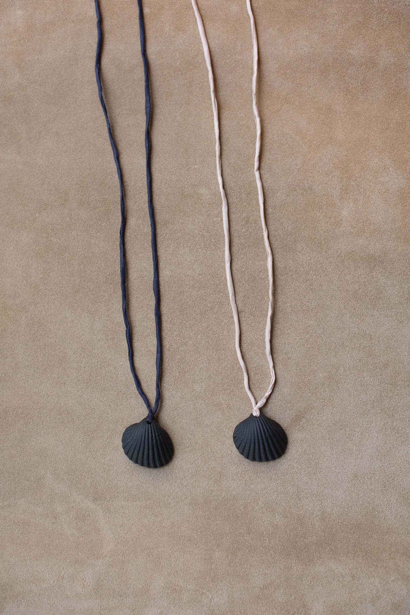 Crafted from black pigmented porcelain and strung on a silk cord, these Nocturnal Shell Amulets symbolises "night" as opposition to "day" as a way to celebrate the dualistic principle to achieve the perfect harmony. Shells symbolise the feminine intuition and believed to bring good fortune.