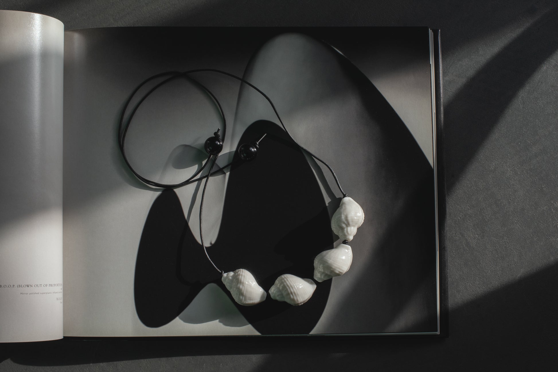 A statement choker featuring four Manà porcelain shell amulets with beautiful luster of glaze, and black onyx endings. Shells symbolise the feminine intuition and believed to bring good fortune. 4 is a special number symbolising four elements, the four directions of the compass ( North, South, West, East), and a symbol of wholeness.
