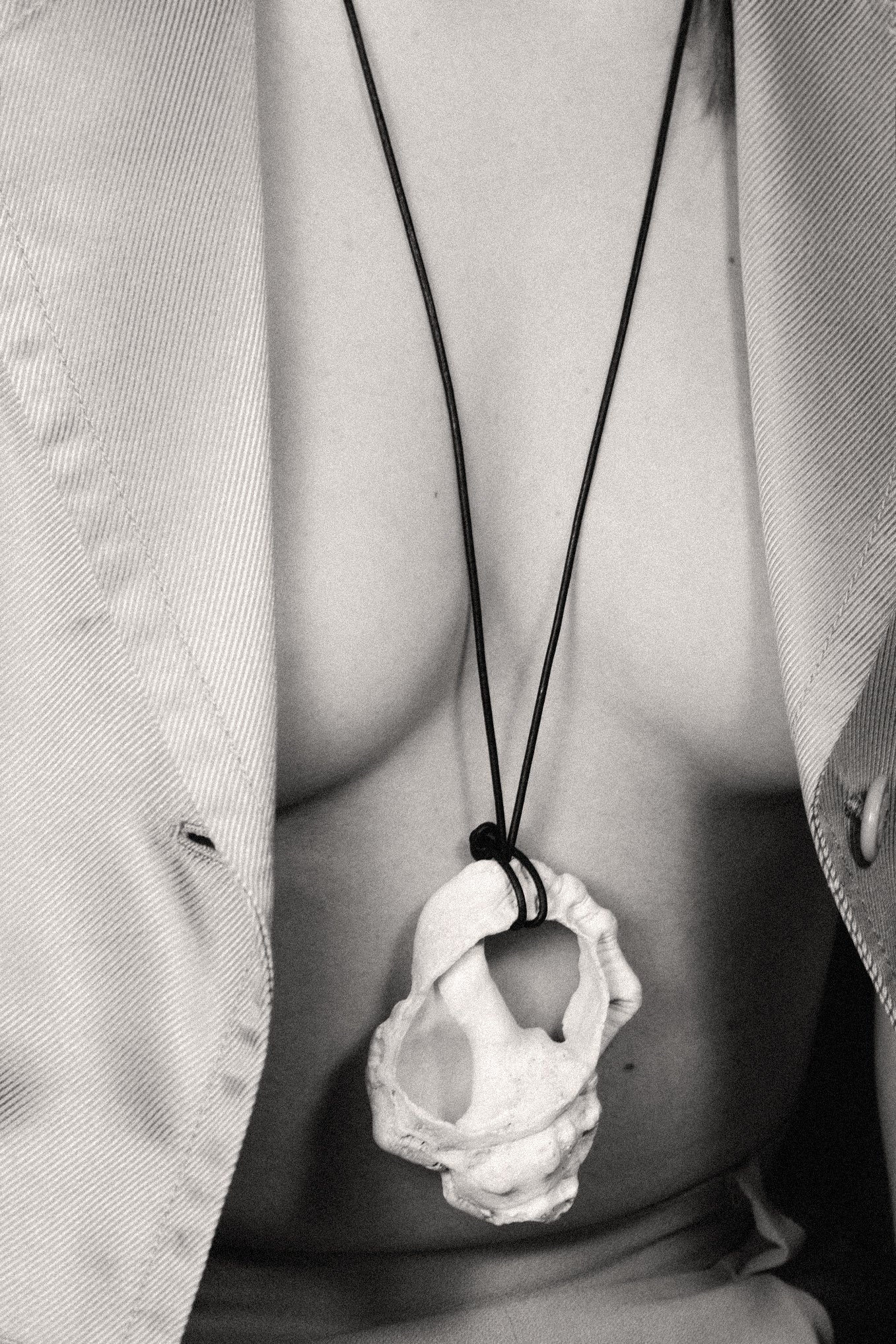 Shell Fossil Pendant strung on leather cord with signature silver hook closure, celebrating the poetic power of untreated, natural found objects, shaped by time, wind and water.