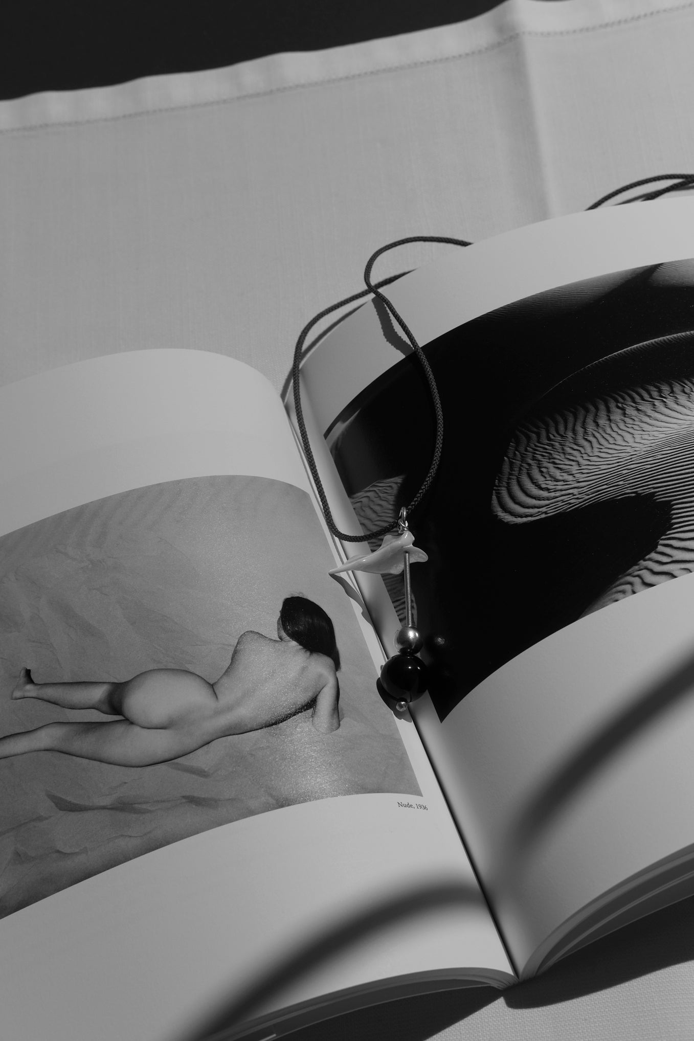 Hand-made from fish bone mother of pearls, onyx and sterling silver, strung on a hand-braided Japanese silk cord.
