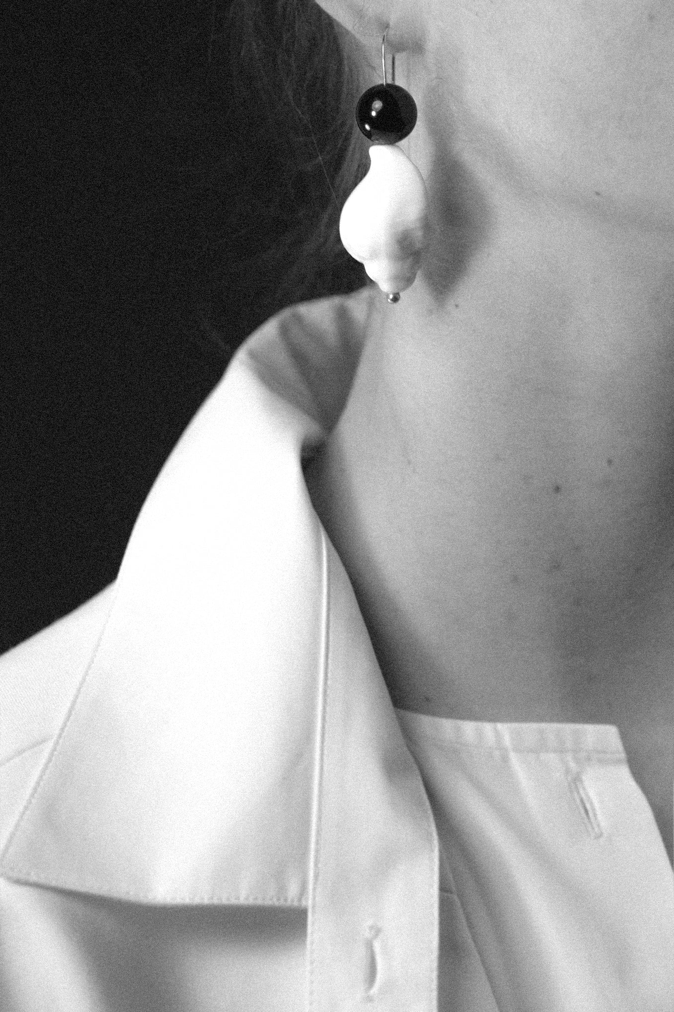 Shell hook earrings, sculpted by hand in white porcelain and paired with Black Onyx.