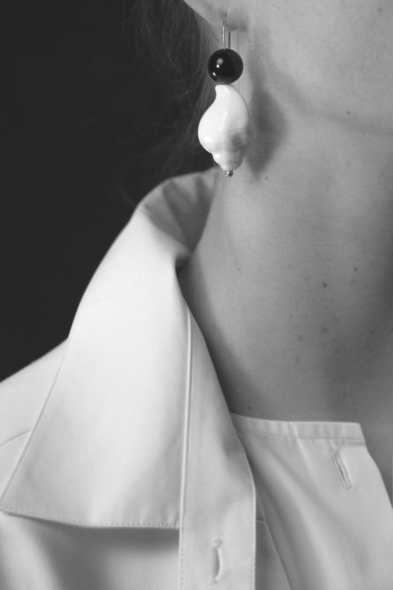 Pair of Shell hook earrings, hand made from white porcelain, combined with Black Onyx.